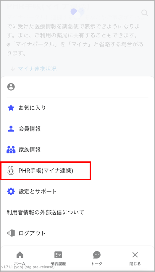 1. 薬急便画面下の「メニュー」>「PHR手帳(マイナ連携)」を選択