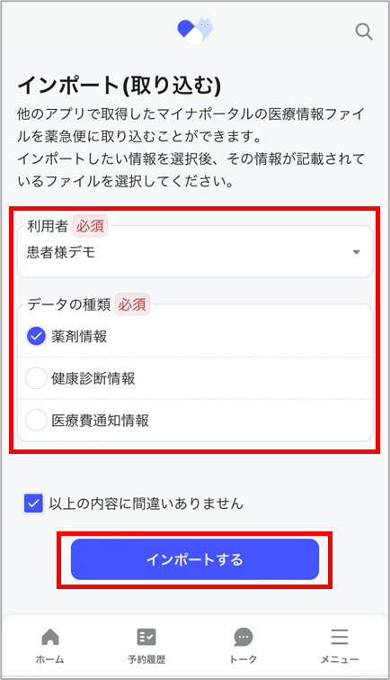 4. 利用者と取り込みたいデータの種類を選び、「インポートする」を選択