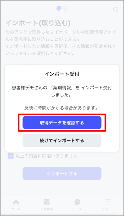 他アプリでマイナポータルから取得した情報を、PHR手帳(マイナ連携)に取り込むことができます。