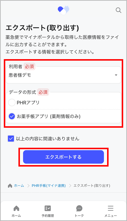 3. 利用者、取り出したいデータの形式を選び、「エクスポートする」を選択